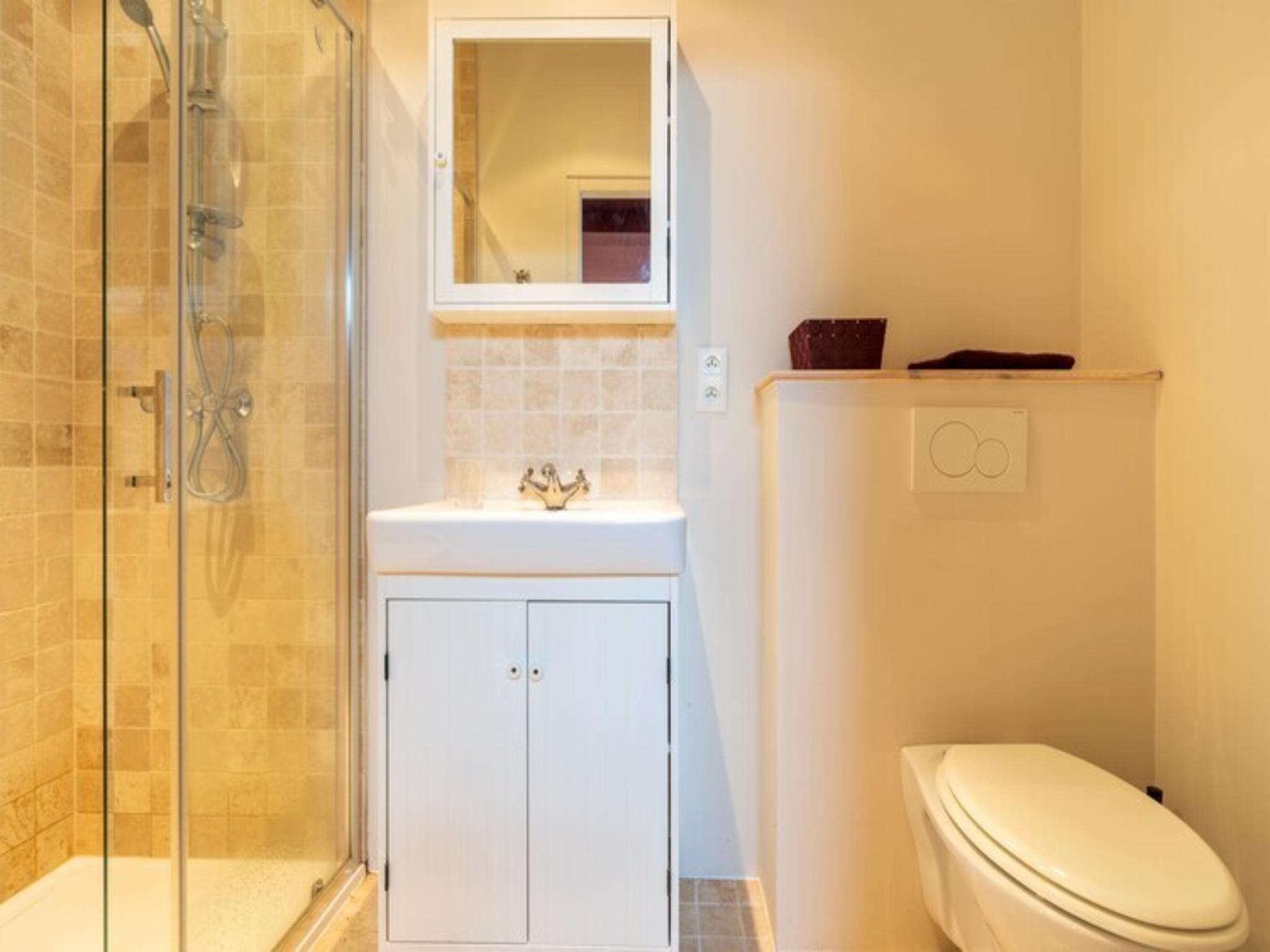 Op de 1e etage: slaapkamer met badkamer met 2-pers. bed, douche, wastafel, wc , slaapkamer met badkamer met 2-pers. bed, douche, wastafel, wc , slaapkamer met badkamer met 2-pers. bed, ligbad, wastafel, wc